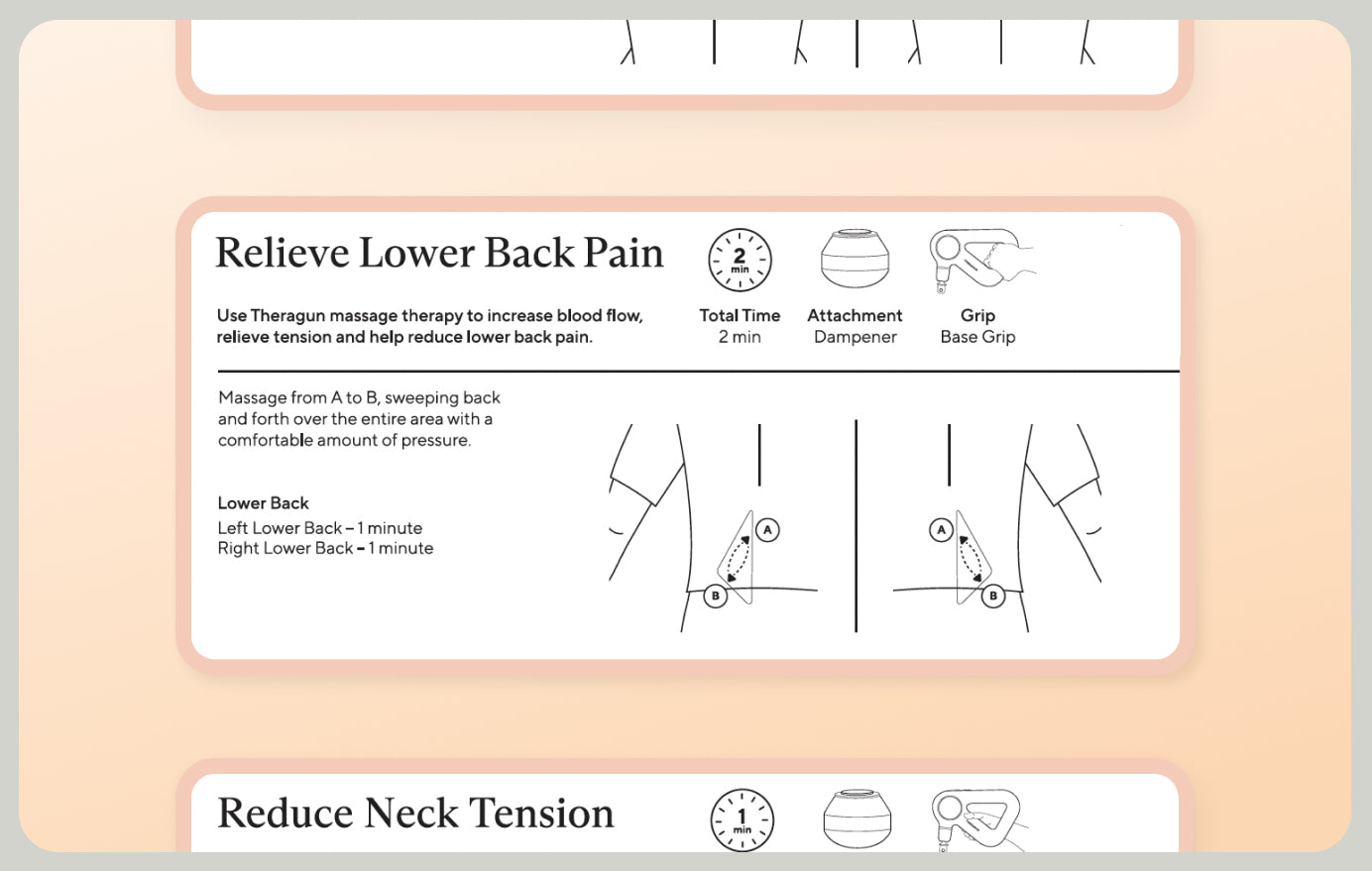 In your Theragun Relief box, you’ll discover 3 simple quickstart routines for relieving aches and pains. Plus, you can find guided video routines on the Therabody App.